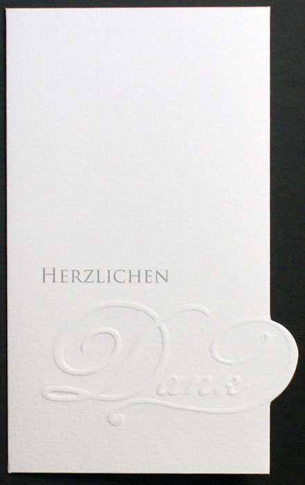Dankkarte aus hochwertigem, weißem Aquarell-Karton mit Konturstanzung und Reliefprägung “Dank”. Das Wort “Herzlichen” ist nur ein Beispiel und ist nicht vorgedruckt.